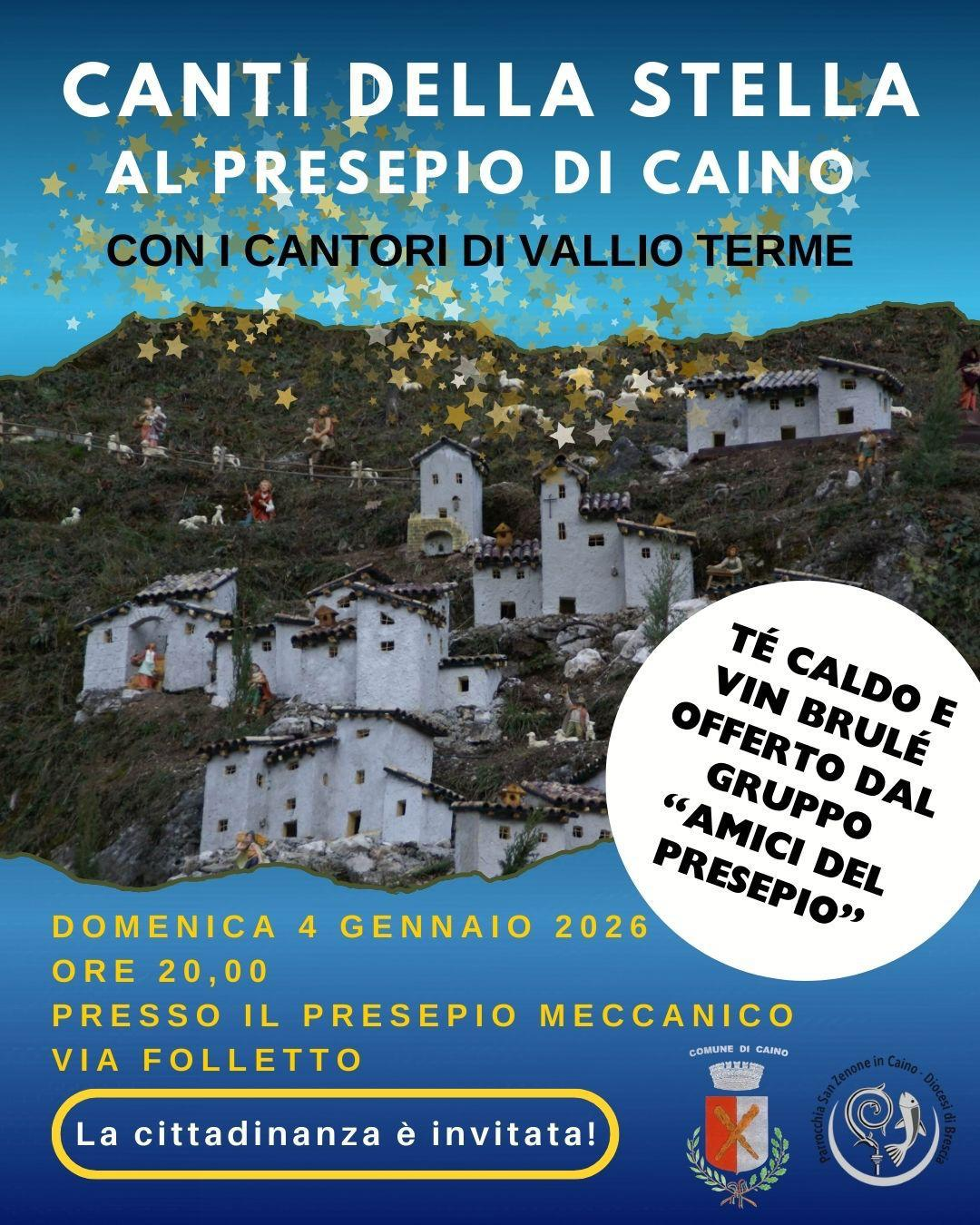 Un'occasione in più per vivere il meraviglioso presepio meccanico di Caino, curato dal gruppo "Amici del presepio" che offriranno té caldo e vin Brulé, allietati dai canti dei "Cantori della stella" di Vallio Terme